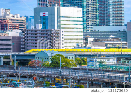 日本の東京都市景観長弩級幸運を呼ぶ新幹線・ドクターイエローや新幹線、芝浦のオフィスビルなどを望む