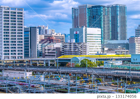 日本の東京都市景観 新幹線や2本の京浜東北線、芝浦アイランドケープタワーなどタワーマンション群…