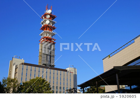 携帯電話会社のビルと電波塔 ローアングル