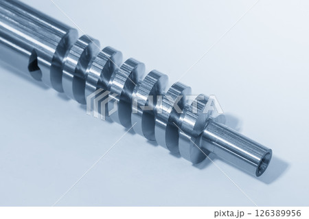 Close up the spiral groove shaft parts in the light blue scene.