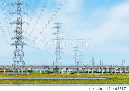 夏の青空と田園風景に広がる郊外の町、緑の田んぼと送電鉄塔のある風景、のどかな郊外に広がる青空と住宅街