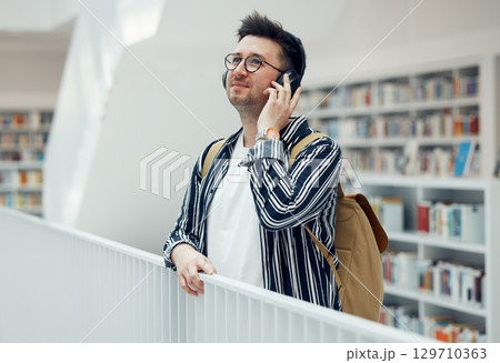 Phone, library and university woman in a education and learning building with a mobile talking. Books, student and research conversation of a college tutor with smile ready for study and book search