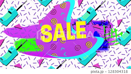 Sale text on purple banner against multiple telephone icons in seamless pattern on white background