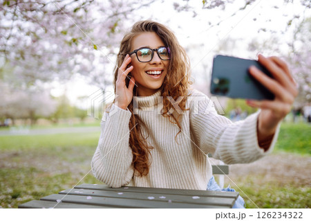 Young woman takes selfie against background of flowering trees in park. Concept of relaxation, fun.