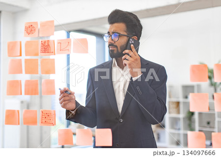 An Indian businessman wearing glasses talks on his phone while looking at sticky notes on a glass wall