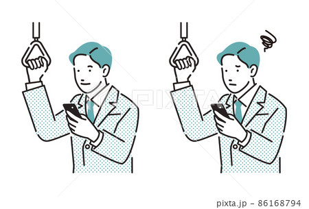 人物 通勤電車の中でスマホを見るビジネスパーソン男性