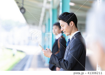 駅のプラットフォームで電車を待つビジネスマン 中堅社員 ビジネスイメージ