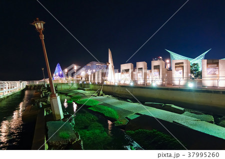 ライトアップされた神戸メリケンパーク付近の空撮