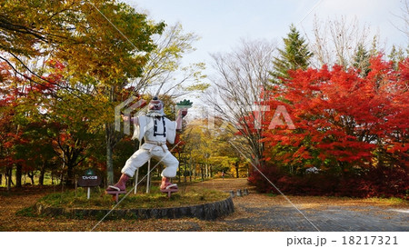 信州 飯綱町霊仙寺湖畔の紅葉と青空に映える天狗様 迫力満点