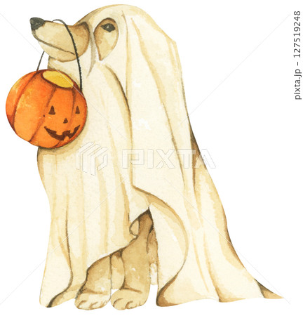 Watercolor Ghost Dog. Trick or Treat. Hand Drawn Halloween Dogs Illustration. Spooky Pet Costume.