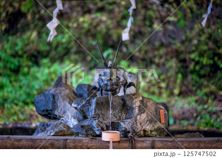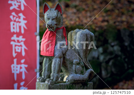 山あいの神社に佇む守り神の狐 狛狐の石像