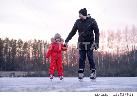Father holding daughter hand while ice skating together on a frozen lake at sunset, winter family activity, bonding, care and outdoor leisure