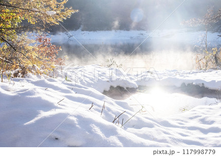 紅葉と霧に包まれた新雪の森