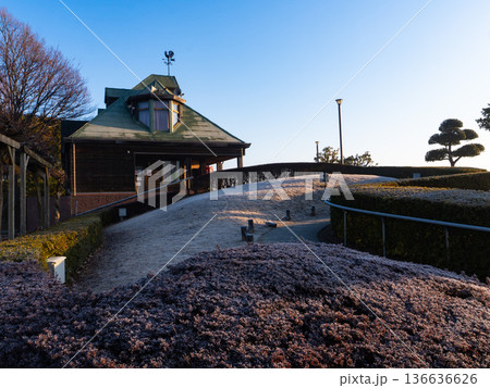 霞ヶ浦総合公園冬の朝陽照らすネイチャーセンター