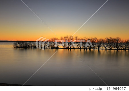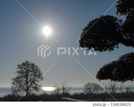 霞ヶ浦総合公園から見た冬の霞ヶ浦の朝日と湖岸の木のシルエット