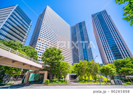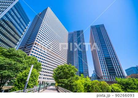日本の東京都市景観 新緑や青空に映える霞が関の文部科学省などを望む