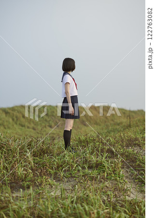 草原に立つ女子高校生の後ろ姿