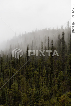 Foggy View of Green Trees in a Rainforest during a rainy summer morning.
