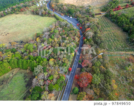 栗野岳レクレーション村沿いの紅葉の道の空撮