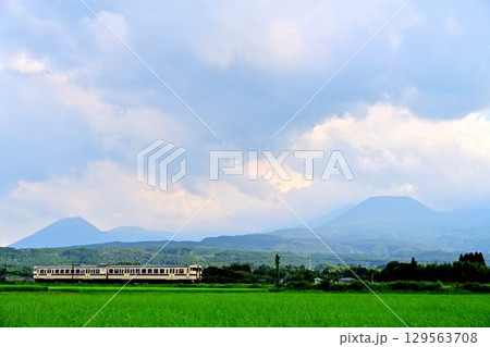 霧島連峰山をバックにして走る白列車