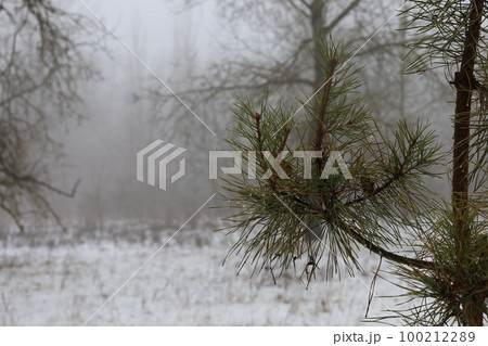 Thick fog in the winter forest, gloomy woods