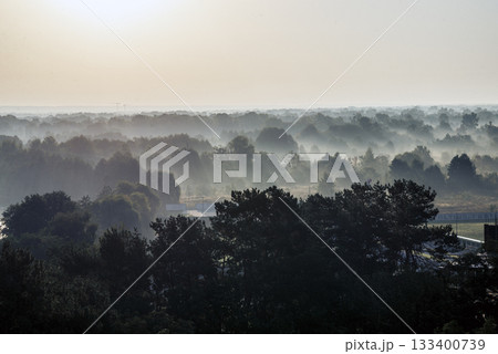 foggy landscape, above deciduous forest, early morning.