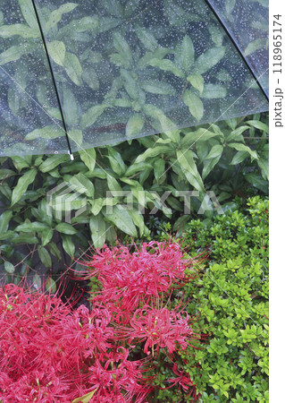 雨に濡れた彼岸花とビニール傘