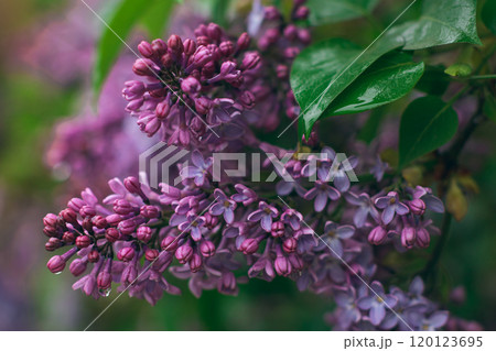 Lilac Branch with Dew Drops in Spring at Daytime After Rain - Close-Up