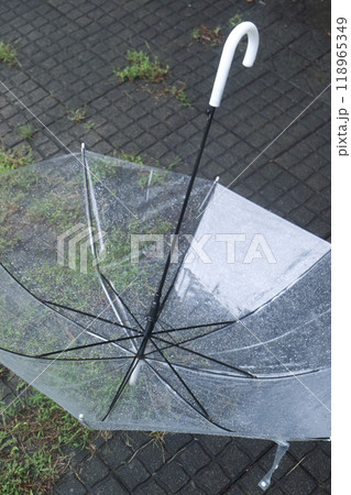 地面に転がった、雨粒の付いたビニール傘