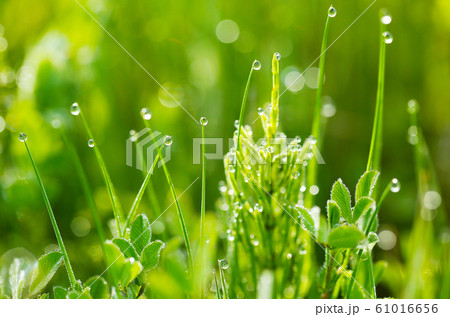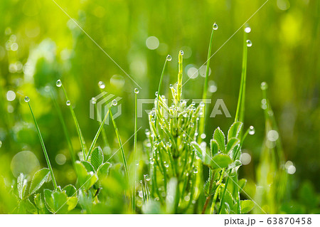 光に反射する美しい露の玉の付いた春の若草と植物のぼやけた緑の爽やかシンプルイラスト素材