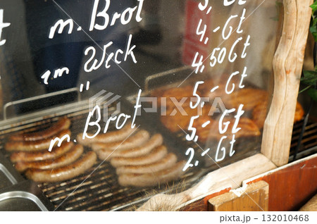 ガラスに値段が書かれたソーセージを売っている店