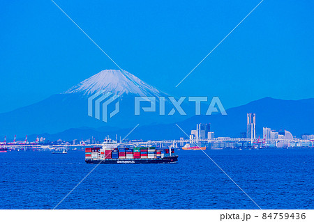 (千葉県)海ほたるPAから眺める横浜方面 行き交う船、富士山遠望