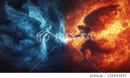 氷と炎の天使が剣で激突する瞬間
