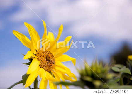 青空に咲き誇るひまわりとミツバチ