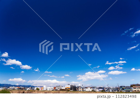 春の青空に浮かぶ白い雲と住宅街