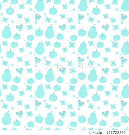 北欧風フルーツのシームレスパターン(りんご・洋ナシ・どんぐり・花モチーフ)(ブルー)
