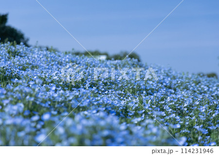 鮮やかなブルーが美しいネモフィラの絨毯と爽やかな青空
