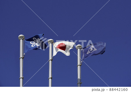 風にはためく福岡県立ありあけ新世高等学校の校章旗