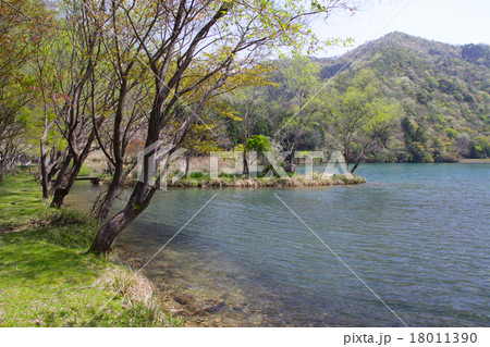 エメラルドグリーンに透き通る水の田口奥池・なぐさの森と新緑「七種の滝(なぐさのたき)の川下にある」