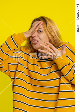 Afraid shocked woman closing eyes, confused shy scared reject to watch, phobia, shame, stress