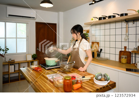 Young woman pouring cooking oil into a frying pan, ready to start the meal preparation