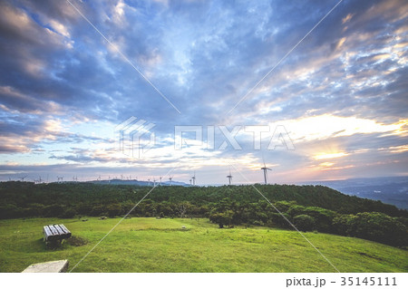 風力発電と夕景