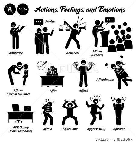 Stick figure human people man action, feelings, and emotions icons starting with alphabet A. Advertise, advise, advocate, affirm, affix sign, afford, affectionate, AFK, afraid, aggressive, agitated.