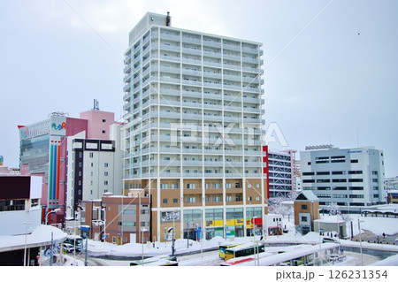 「青森県」雪景色の八戸市中心街の風景・中核都市 冬
