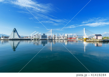 【青森県青森市】早朝の青森ベイエリア、快晴の風景