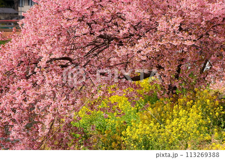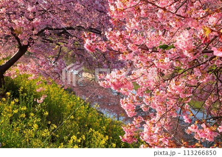 埼玉県久喜市鷲宮 青毛堀川沿いの満開の河津桜並木と菜の花畑の景色