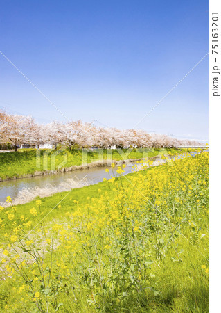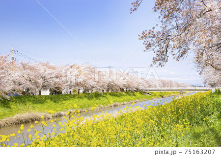 埼玉県久喜市 青毛堀川 ソメイヨシノの桜並木と菜の花の風景埼玉県久喜市 青毛堀川 ソメイヨシノの桜並