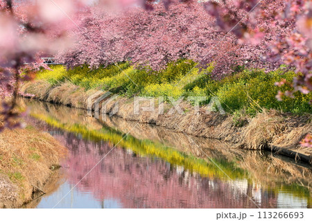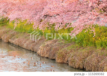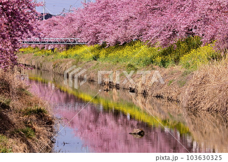 埼玉県久喜市鷲宮 青毛堀川沿いの満開の河津桜並木と菜の花畑と川面のリフレクションの景色