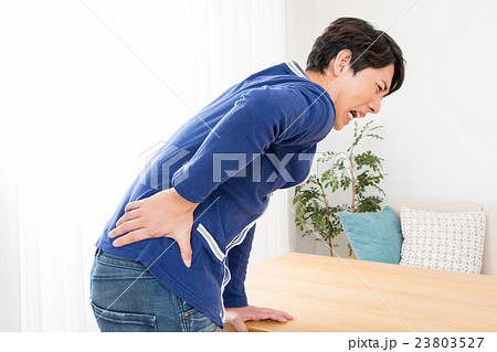 ぎっくり腰 腰痛 腰が痛い 男性 ポートレート 男の人 リビング コピースペース