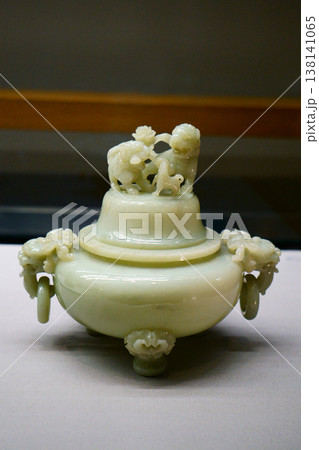 9452 獅子鈕牡丹図脚青玉香炉
